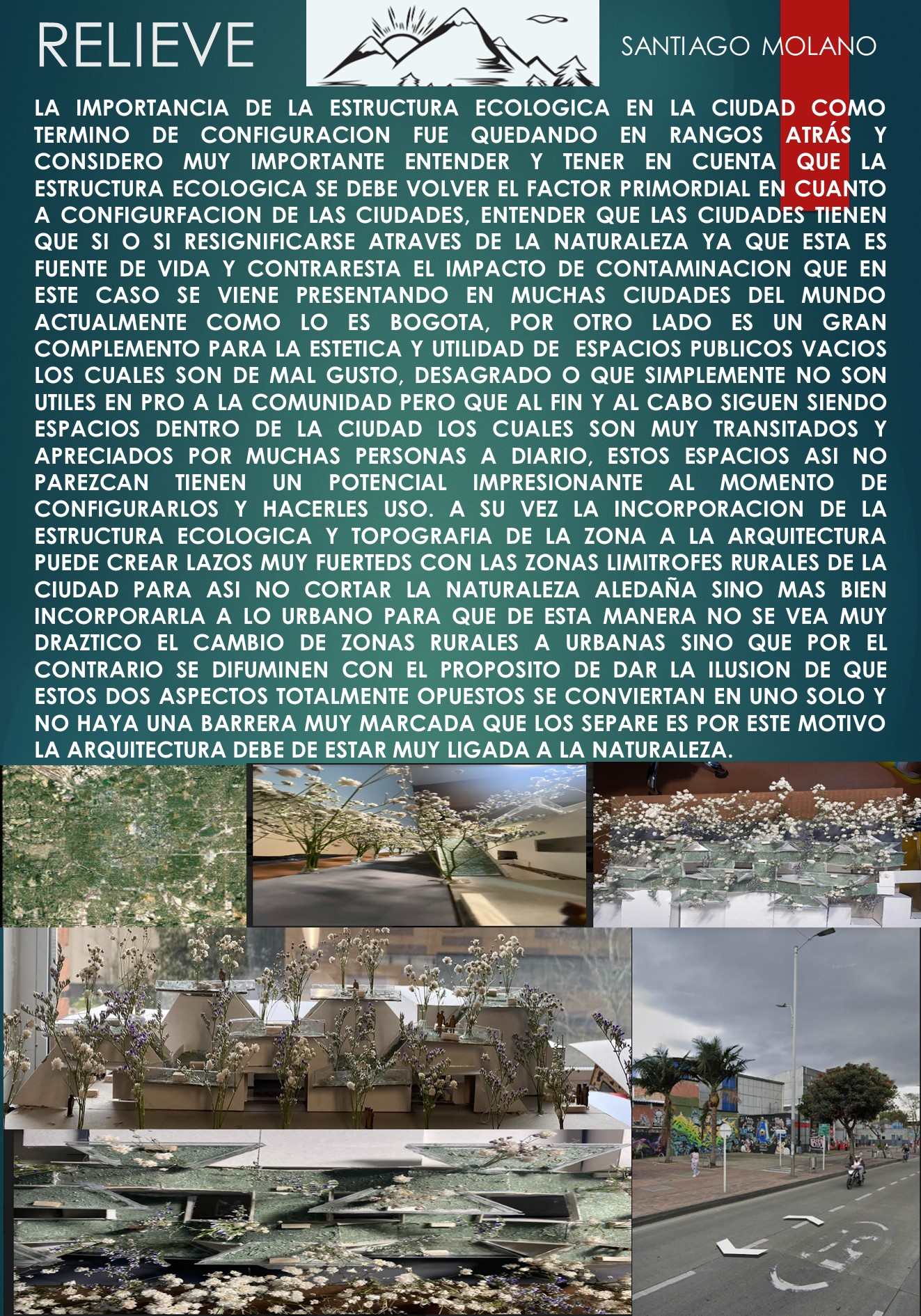 New development perspectives for the city of Bogotá are investigated, using it as a physical space for research and implementation of various spatial development methodologies, aimed at defining new devices and urban-architectural groupings based on emerging modes of "local development" promoted by endogenous and exogenous dynamics typical of the contemporary world.