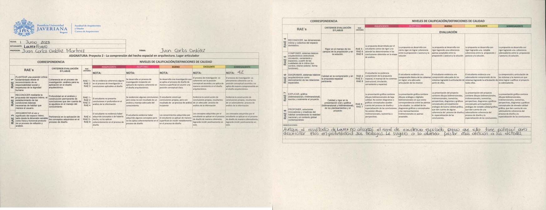 The value of the space and of the relations between spaces into the architecture. The subject proposes to introduce the student to the understanding of the spatial fact through the intimate habitat, the house, the dwelling, the refuge, or any form that shelters the basic functions of rest, food, hygiene and socialization. Living arises in both individual and collective dimensions, in which the events of daily life transcend the interior space to transform the place where the project is implanted. Clarify the relationship between the ideas that support the architectural fact, the elements that make up the form in architecture, and the spatial organization, through 'composition systems',' principles of order 'and the notion of' field structure '. Introduce from concepts such as proportion and scale.
